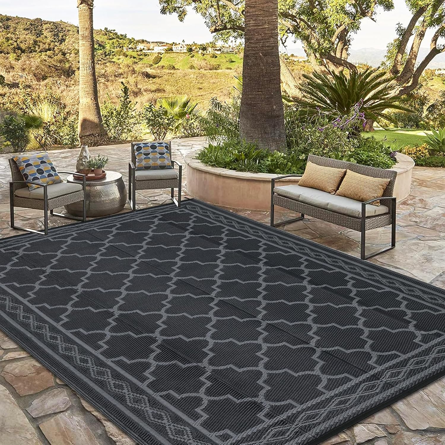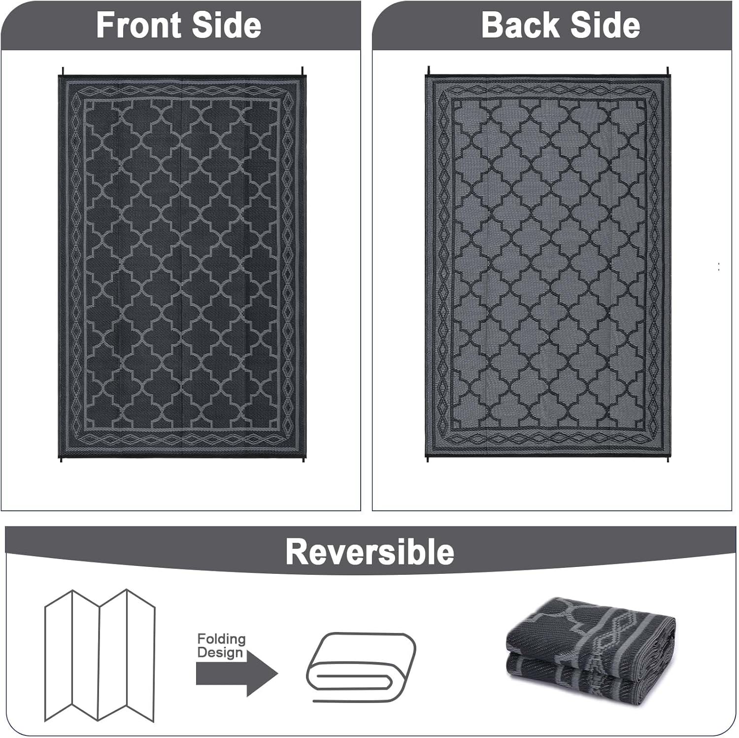 IMINROME Outdoor Rug 8×10 Waterproof Patio Rug Mat Geometric Rug Plastic Straw Outside Rug for RV Camping Picnic Reversible Rug Modern Clearance for Deck, Beach, Black/Grey